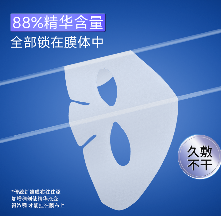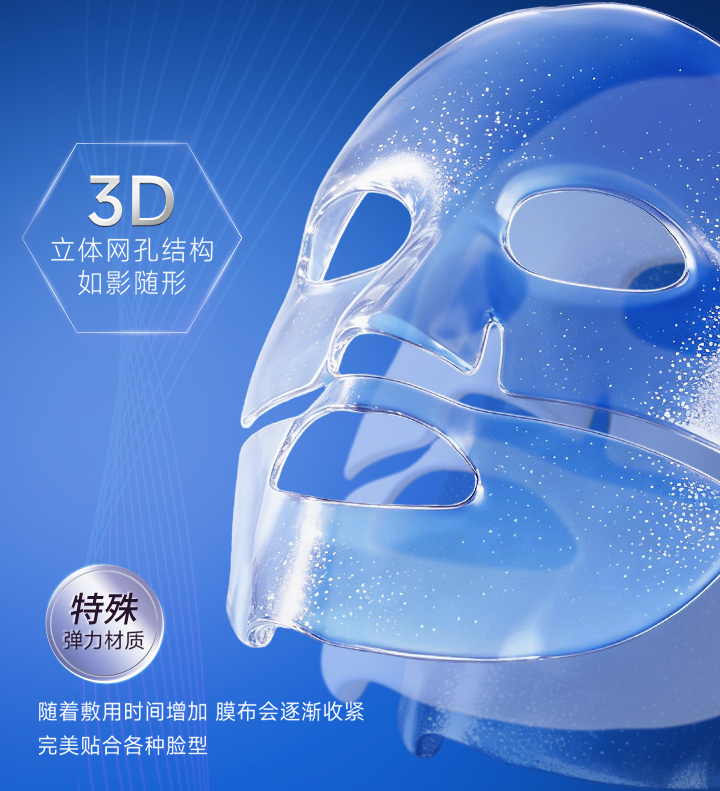 同时,基于 “妆械同源” 理念的专利制备工艺,采用高能电子束交联技术,无需化学交联剂,杜绝化学残留风险,生物相容性更佳。结合符合人脸工学的3D立体弹力网格剪裁,面膜能如“第二层皮肤”般贴合各种脸型,实现久敷不滑落、不滴液,确保每一滴精华都被有效利用。